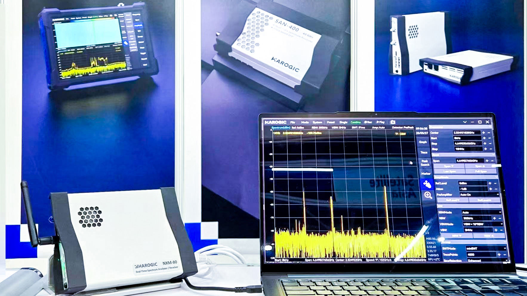 HAROGIC представила свои новейшие защищённые спектроанализаторы стандарта IP68, USB спектроанализатор SAN-400 и новейшее программное обеспечение спектроанализатора SAStudio4, а также обсудила с клиентами индивидуальные решения для встроенных RF‑систем на основе HAROGIC API. Спектроанализатор HAROGIC, рассчитанный на частоты до 40 ГГц, привлёк внимание благодаря сбалансированным характеристикам, высокой точности и универсальным режимам измерения, а также способности удовлетворять потребности высокочастотных исследований.