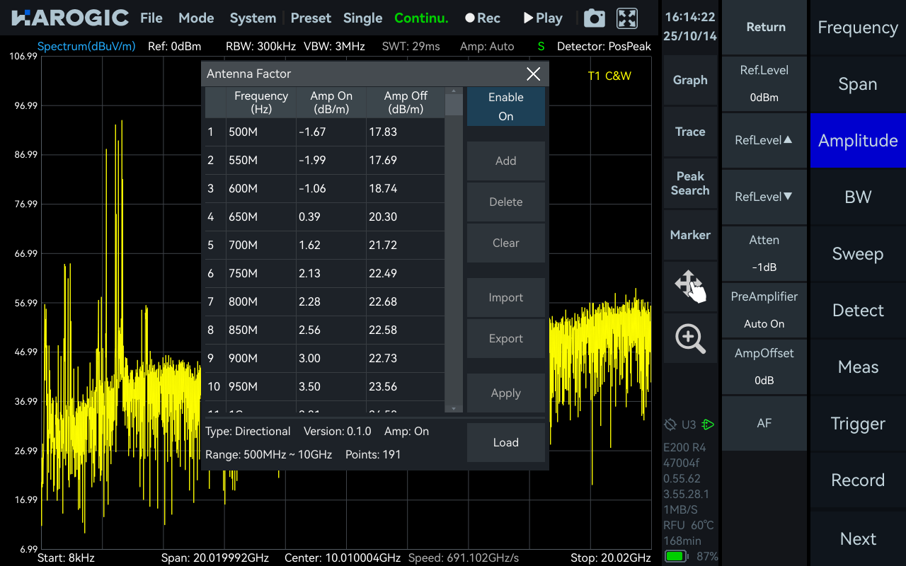 HDA-100 обеспечивает глубокую интеграцию аппаратного и программного обеспечения. При использовании с программой спектрального анализа SAStudio4 коэффициент антенны загружается автоматически, что значительно упрощает настройку тестирования и обеспечивает точность данных. В то же время встроенная функция отображения состояния показывает состояние антенны и усилителя в реальном времени непосредственно в интерфейсе программного обеспечения, позволяя пользователям чётко контролировать состояние антенны.